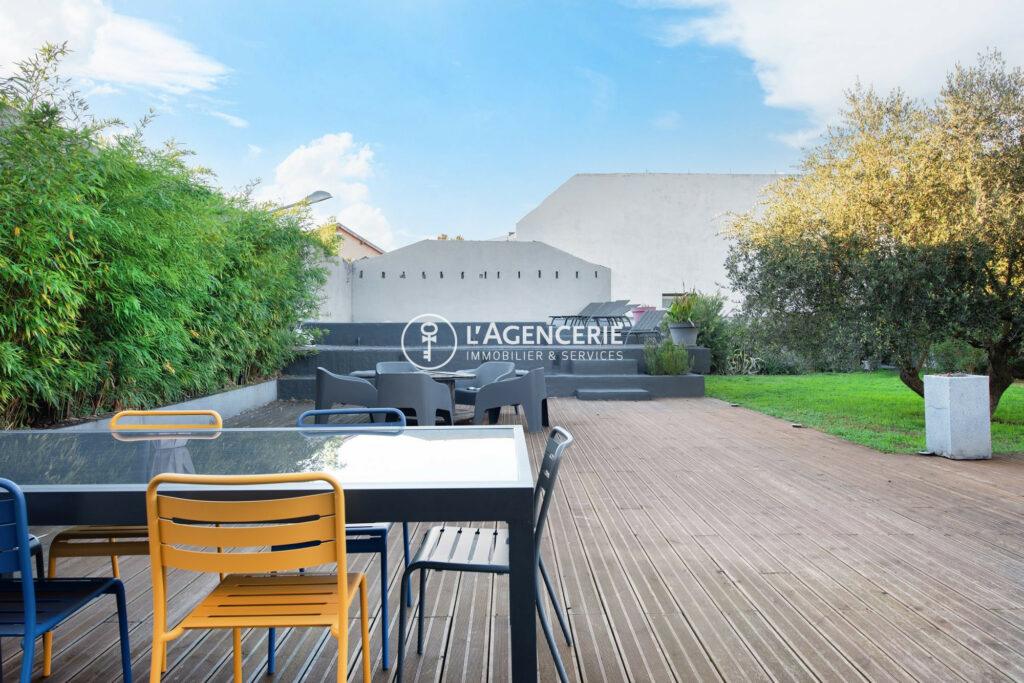 Un extérieur polyvalent : La terrasse en bois s’étend vers un jardin soigneusement aménagé, une piscine avec terrasse synthétique, un terrain de pétanque et un second garage transformé en home gym, offrant un véritable sanctuaire extérieur pour le loisir et la relaxation.