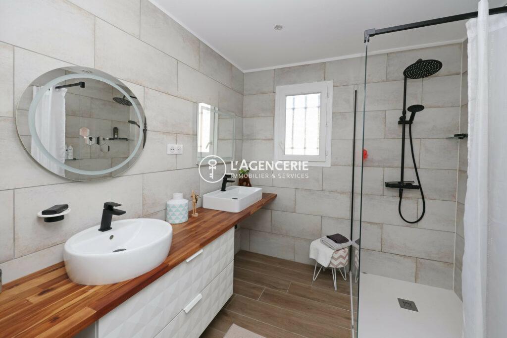 La partie nuit, bien séparée, se compose de trois chambres, d’un bureau (ou 4e chambre), et d’une salle d’eau moderne avec double vasque et douche à l’italienne.