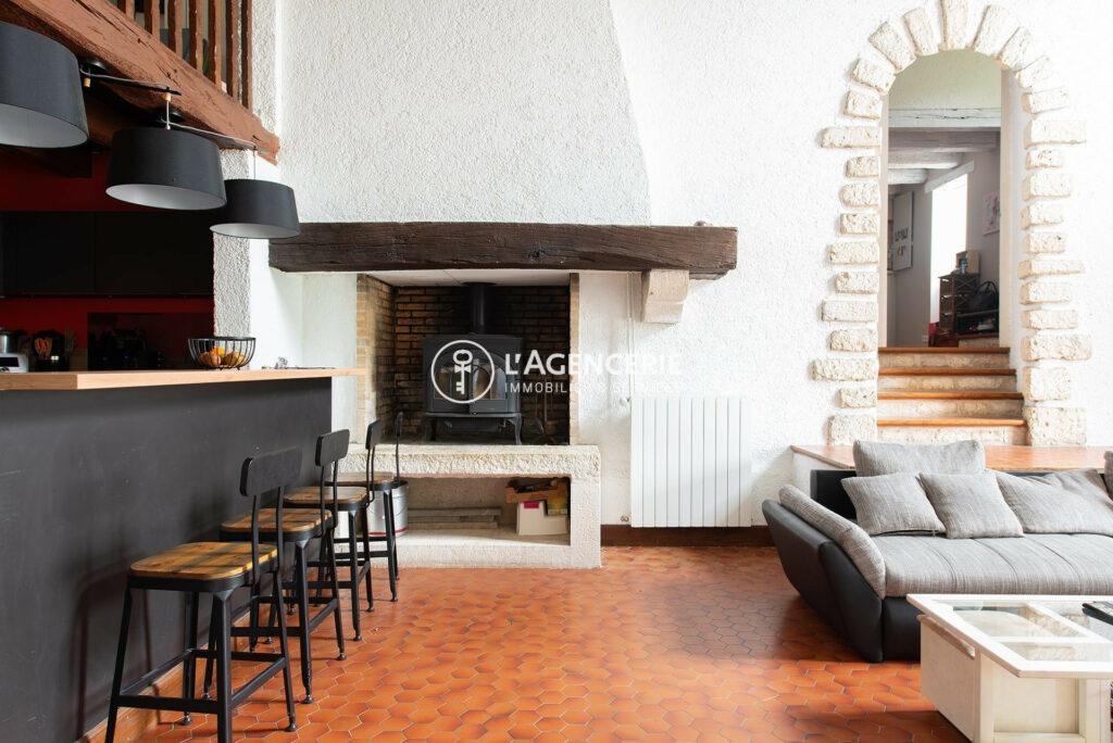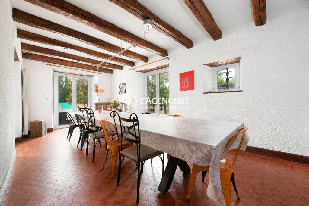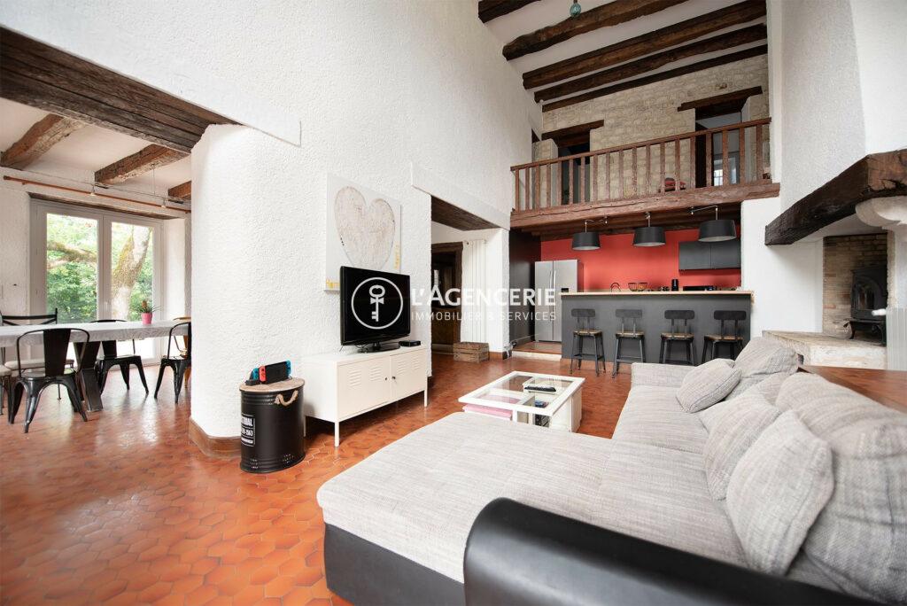 Au rez-de-chaussée, une entrée mène à une vaste pièce de vie de 65 m² avec cuisine ouverte au cachet d’époque et insert, un salon télé intimiste, un second espace avec cuisine indépendante et buanderie donnant sur la cave. Vous trouverez également une grande pièce de 54 m² aux usages multiples : salle de réception, espace enfants ou atelier selon vos besoins.