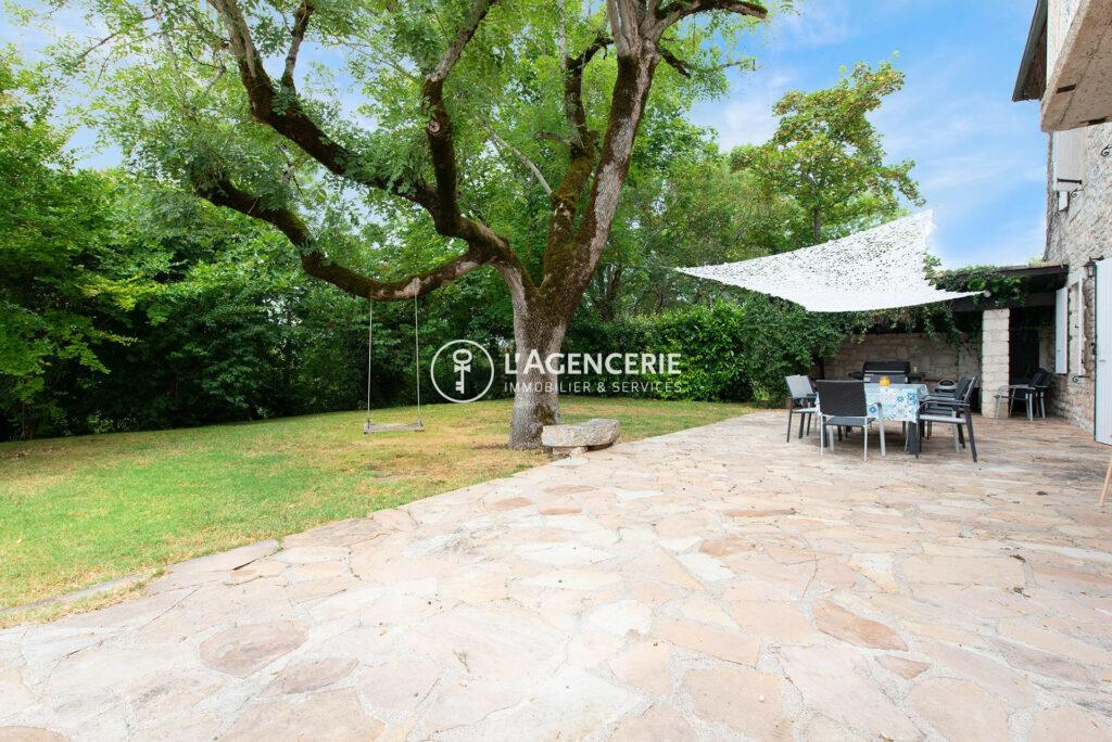 Le charme se poursuit à l’extérieur avec un pigeonnier, une piscine en pierre de Bali bordée d’une terrasse, un jardin arboré, un espace avec four à pain et une grange d’environ 100 m² à aménager selon vos envies.