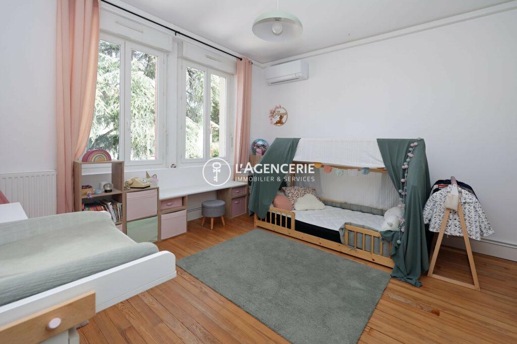 À l’étage, l’espace nuit se compose de trois chambres de beaux volumes, dont une suite bénéficiant de sa propre salle d’eau. Un bureau, idéal pour le télétravail, une vaste salle de bain ainsi qu’un WC indépendant complètent ce niveau avec élégance et fonctionnalité.