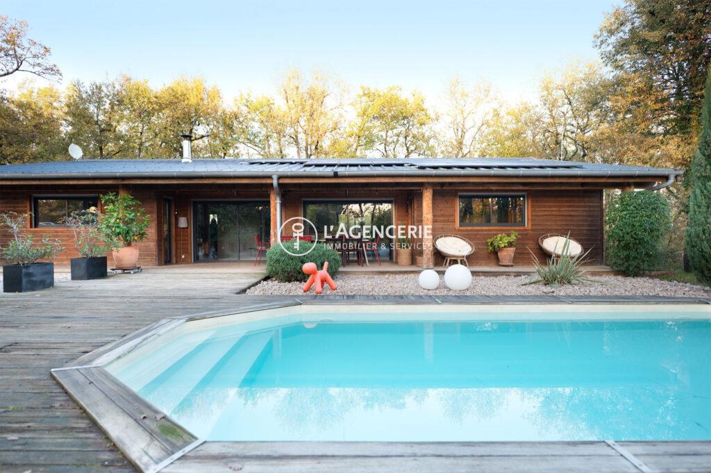 À l’extérieur, la maison profite d’une terrasse couverte de 40 m² donnant sur la piscine, ainsi qu’une terrasse suspendue de 20 m² à l’arrière, offrant une vue dégagée sur le bois.