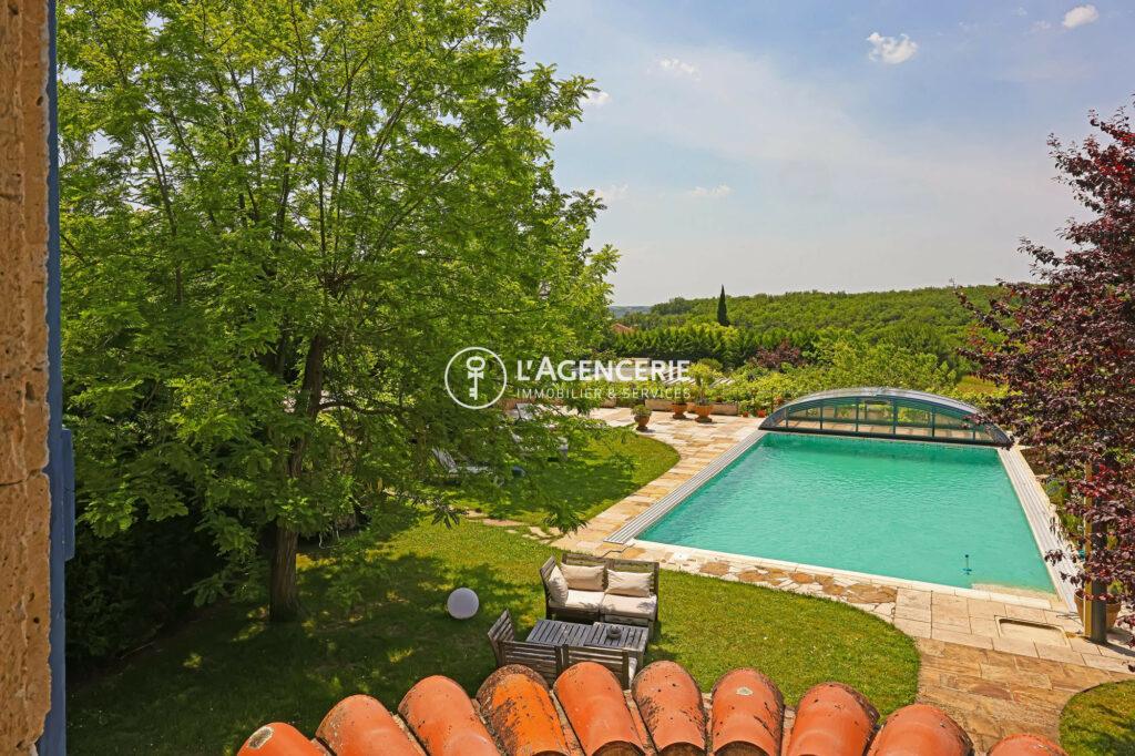 À l’extérieur, un grand parking, un jardin agréable et facile à entretenir, une piscine avec terrasse, un grand garage et une cave viennent compléter ce bien d’exception.